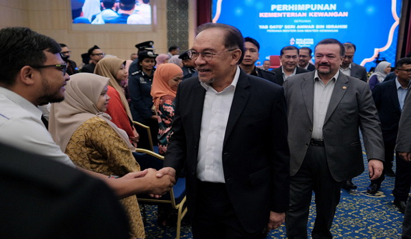 Datuk Seri Anwar Ibrahim bersalaman dengan warga Kementerian Kewangan pada Majlis Perhimpunan Bulanan dan Perjumpaan Warga Kementerian Kewangan serta Agensi di Kementerian Kewangan hari ini / BERNAMA