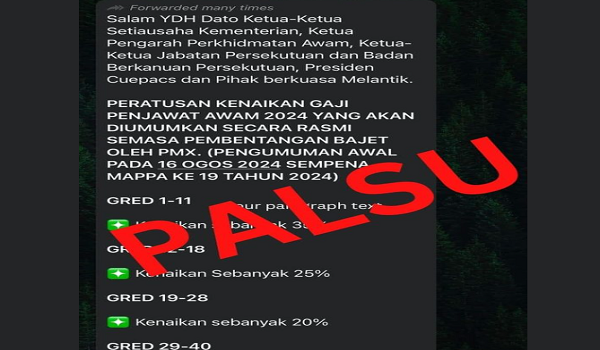 Berdasarkan maklumat kandungan palsu tersebut,ia mendakwa kenaikan gaji penjawat awam bagi tahun 2024 kononnya akan diumumkan secara rasmi oleh Perdana Menteri semasa pembentangan bajet.
