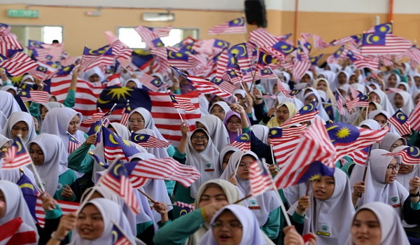Pelajar-pelajar SMK Putrajaya Presint 9 (1) mengibarkan Jalur Gemilang pada Program Pentarama X Kelab Malaysiaku sempena Sambutan Bulan Kebangsaan 2024 di SMK Putrajaya Presint 9 (1)/ BERNAMA