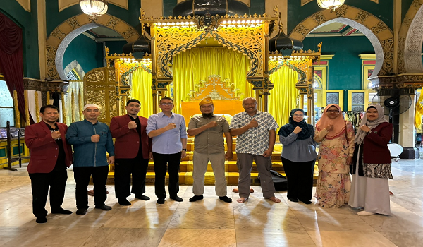 Wakil UUM,UISU dan UCA bergambar dengan wakil Sultan Deli di hadapan singgahsana yang menjadi salah satu tarikan kepada pelancong di Istana Maimun/Foto UUM