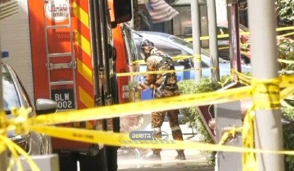 Seorang anggota bomba memakai topeng keselamatan sedang membersihkan diri dirakam pemberita RTM di lokasi kejadian hari ini