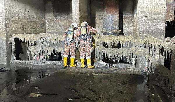 Pasukan bomba lengkap dengan alat pernafasan memasuki stesen pam di Loji Indah Water Konsortium (IWK) Pantai Dalam hari ini/JBPM