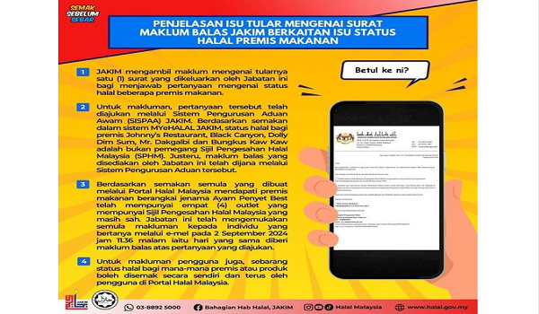 Sementara itu,JAKIM berkata pengguna boleh menyemak sendiri maklumat berhubung status halal mana-mana premis atau produk di Portal Halal Malaysia melalui pautan http://myehalal.halal.gov.my/portal-halal/v1/index.php.
