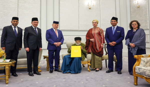 KUALA LUMPUR,23 Oktober-Yang di-Pertuan Agong Sultan Ibrahim berkenan mengurniakan watikah pelantikan profesor diraja kepada tokoh intelekIslam Tan Sri Dr Syed Muhammad Naquib Al-Attas di Istana Negarahari ini.