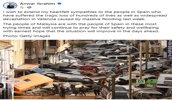 KUALA LUMPUR,5 November- Perdana Menteri,Datuk Seri Anwar Ibrahim menyampaikan simpati kepada seluruh rakyat Sepanyol,akibat banjir besar.