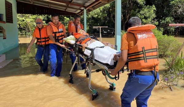 Anggota Pertahanan Awam Malaysia menyelamatkan seorang warga emas dengan mengusungnya ke tempat selamat semasa operasi banjir
