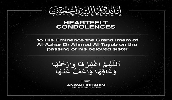 Perdana Menteri Datuk Seri Anwar Ibrahim menzahirkan ucapan takziah kepada Imam BesarAl-Azhar Al-Sharif(Sheikh Al-Azhar)Prof Dr Ahmad Muhammad Ahmad At-Tayyebatas pemergian kakaknya,Samiha Mohammed Ahmad Al-Tayyeb.