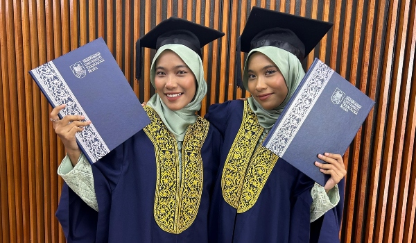 Pasangan kembar Maisara Batrisyia Zainuddin dan Maisuri Batrisyia Zainuddin menamatkan pengajian Diploma Kelas Pertama dalam jurusan Ukur Bangunan/Foto UiTM