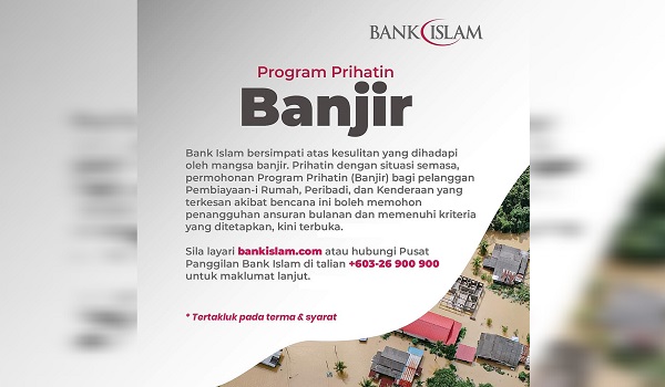 "Permohonan untuk bantuan kewangan di bawah Program Prihatin Banjir boleh dibuat di cawangan Bank Islam terdekat dalam tempoh tiga bulan insiden," kata bank itu.