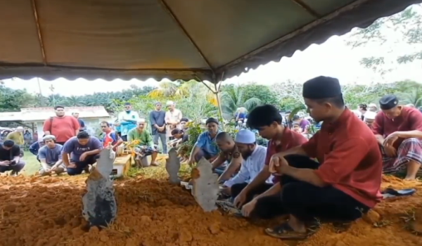 Jenazah dua beradik yang maut dalam tragedi tanah runtuh di Kampung Bukit Apit,Ajil,selamat dikebumikan dalam satu liang lahad di Tanah Perkuburan Islam Kampung Panggung,Ajil / Foto RTM