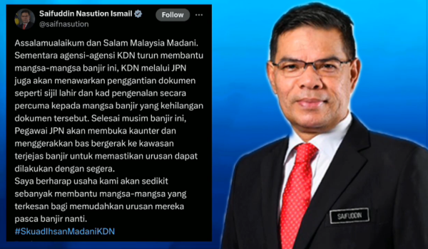 Menteri Dalam Negeri,Datuk Seri Saifuddin Nasution berkata mangsa yang terlibat boleh hadir ke kaunter Jabatan Pendaftaran Negara atau menerusi kaunter dan bas-bas bergerak yang akan beroperasi di lokasi-lokasi terlibat selepas banjir reda.