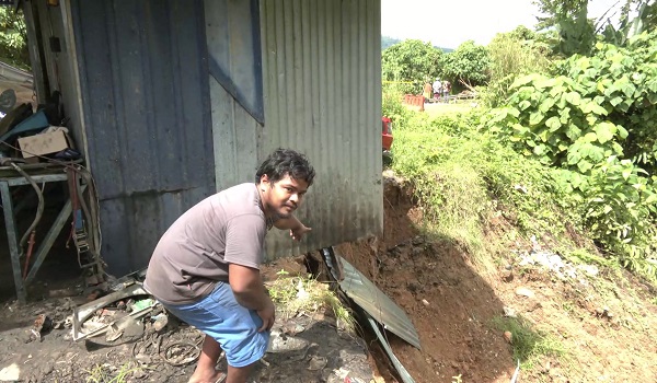 Mohammad Hazerel Ashraf Hazelan menunjukkan kawasan hakisan tanah runtuh di bahagian belakang stor bengkel keretanya/RTM