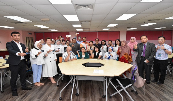 Alumni UPSI dari Uzbekistan bergambar bersama barisan pengurusan tertinggi UPSI sambil memegang kad Alumni Chapter Uzbekistan