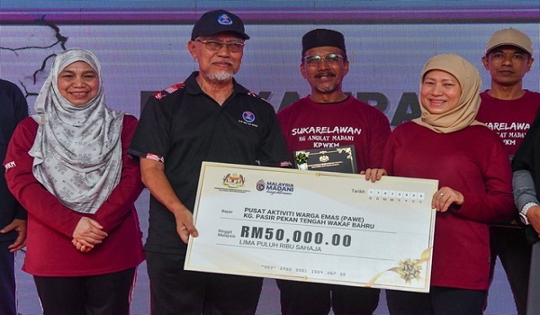 Datuk Seri Nancy Shukri menyampaikan replika cek kepada Pengerusi Pusat Aktiviti Warga Emas @3A pada Majlis Perasmian Program Integrasi Kasih MADANI KPWKM di Kampung Pasir Pekan/ BERNAMA