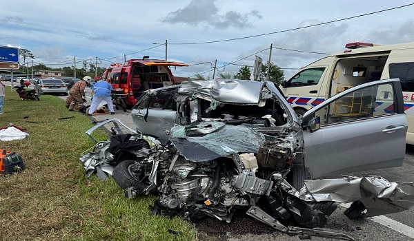 Kemalangan dipercayai berlaku apabila kereta dipandu mangsa,seorang wanita berusia 22 tahun,masuk ke laluan bertentangan ketika cuba memotong kenderaan di hadapannya,sebelum merempuh sebuah lori.