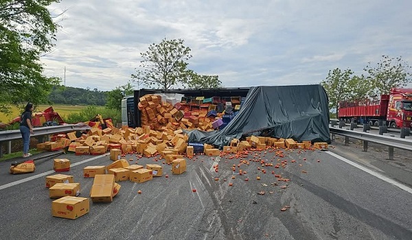Pin kunci tercabut, lori treler bawa muatan tomato terbalik di Pendang