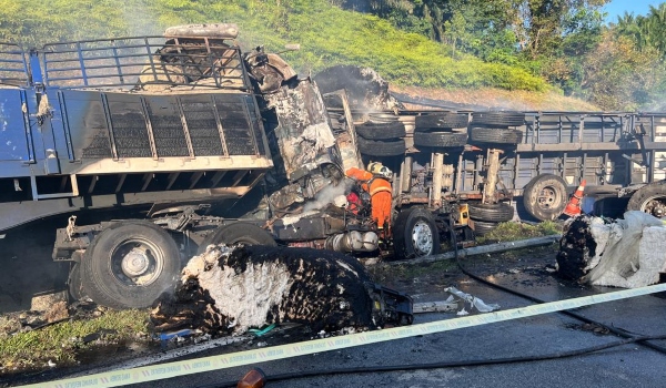 Seorang pemandu lori berusia lingkungan 40an dan lelakinya berusia 20an yang juga kelindan ditemui rentung di bahagian hadapan kepala lori yang terbakar selepas kemalangan/Foto Polis