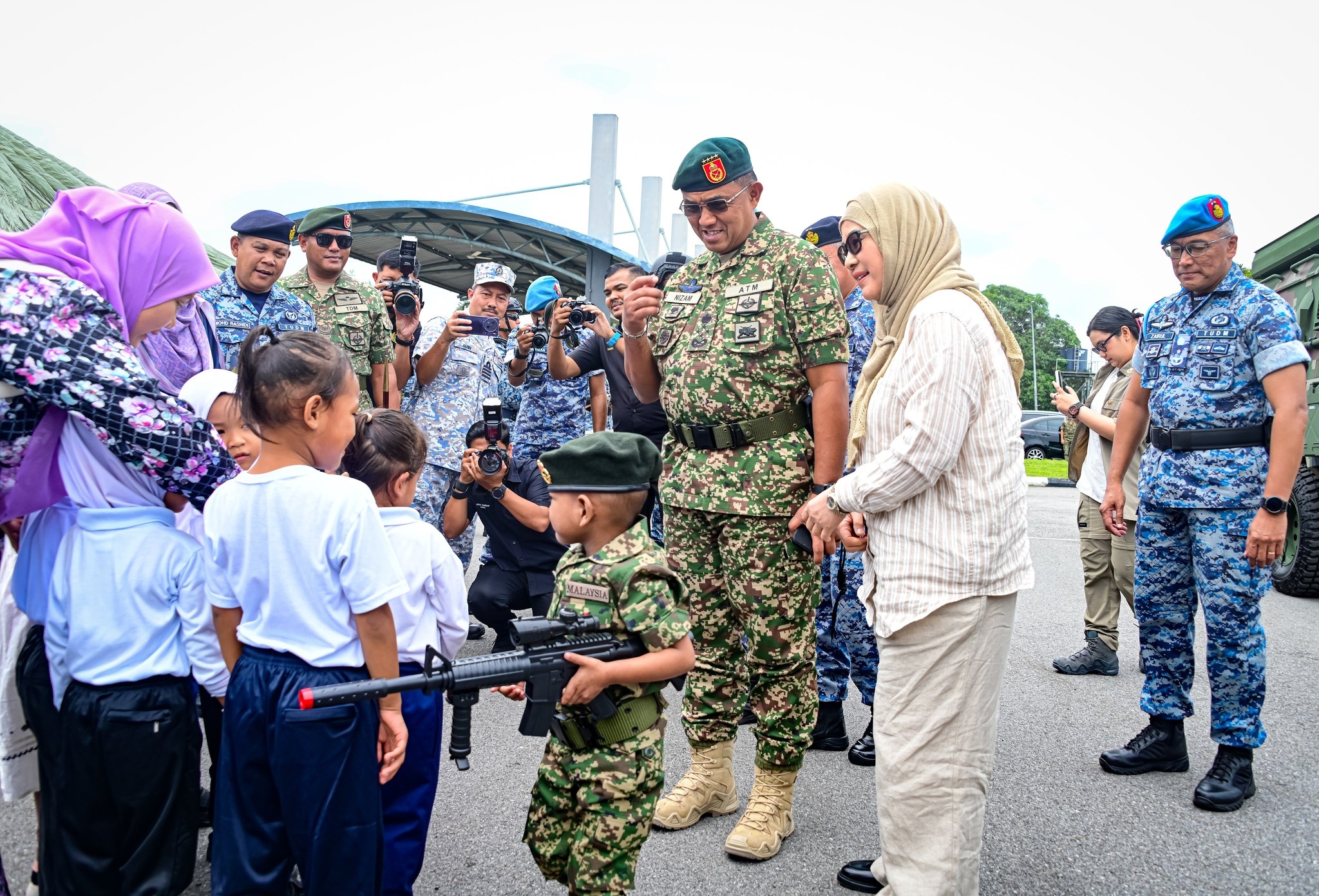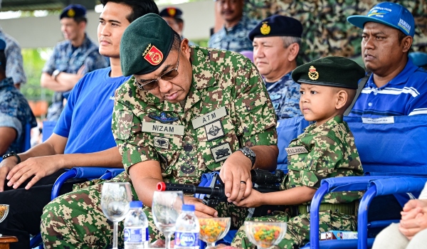 Panglima Angkatan Tentera (PAT),Jeneral Datuk Mohd Nizam Jaffar bersama Akif Ziyan mengenakan pakaian celoreng ketika diraikan sebagai 'askar' oleh Angkatan Tentera Malaysia di Pangkalan Udara Jugra hari ini/Foto ATM