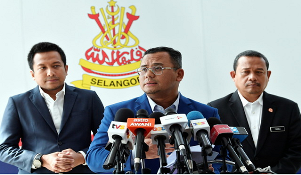 Datuk Seri Amirudin Shari (tengah) semasa sidang media mengenai perkembangan berkaitan kejadian kebakaran saluran paip gas yang berlaku di Putra Heights pada 1 April lalu di Wisma Dewan Annexe Bangunan Setiausaha Kerajaan Negeri Selangor hari ini / BERNAMA