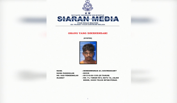 Ketua Polis Melaka,Datuk Dzulkhairi Mukhtar memberi amaran kepada suspek agar segera menyerah diri bagi membantu siasatan kes terbabit.