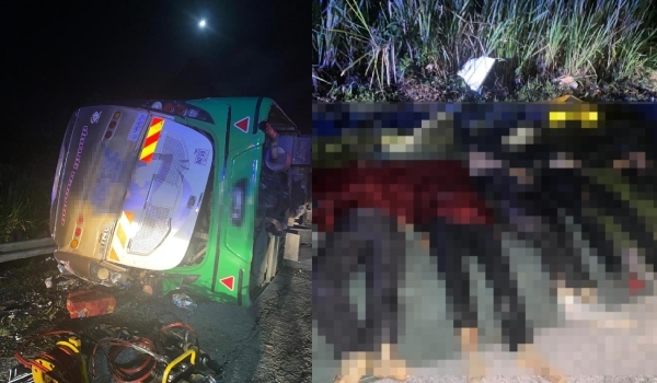 Keadaan bas yang terbalik dan sebahagian mangsa yang terkorban dalam nahas membabitkan pelajar UPSI dengan sebuah kereta MPV di Lebuh Raya Timur-Barat,dekat Banjaran Titiwangsa,Hulu Perak,awal pagi tadi/Foto Bomba Perak