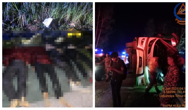 Keadaan bas yang terbalik dan sebahagian mangsa yang terkorban dalam nahas membabitkan pelajar UPSI pagi tadi/Foto Bomba dan APMM