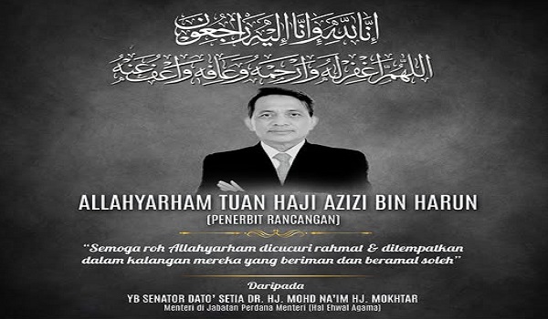 KUALA LUMPUR 20 Ogos - Menteri di Jabatan Perdana Menteri (Hal Ehwal Agama),Datuk Dr. Mohd Na'im Mokhtar merakamkan dukacita dan ucapan takziah kepada keluarga Allahyarham Azizi Harun,Penerbit Rancangan RTM,yang telah kembali ke rahmatullah hari ini .