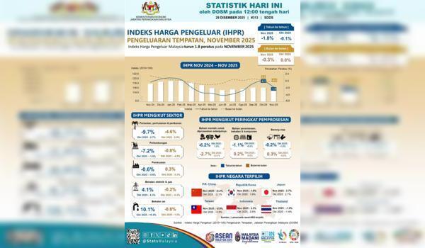 KUALA LUMPUR,29 Disember - Indeks Harga Pengeluar (PPI) Malaysia,yang mengukur perubahan harga di peringkat pengeluar,terus mencatat penurunan sebanyak 1.8 peratus pada November 2025,berbanding penurunan 0.1 peratus pada Oktober 2025.